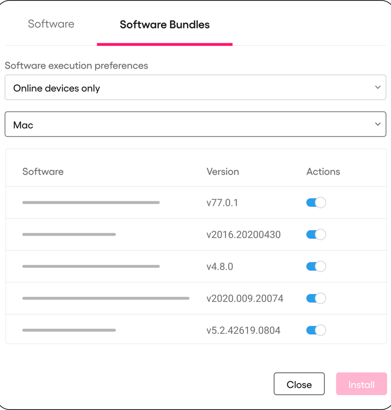 Managing a software inventory for an end-user requires the reconciliations of licenses and installed instances. The remote access and process automation features enable the automated onboarding of new Macs and new users, so you can install software automatically per device or in bulk. Versions can be updated automatically, and services and operating systems can be patched remotely thanks to the Mac agent.
